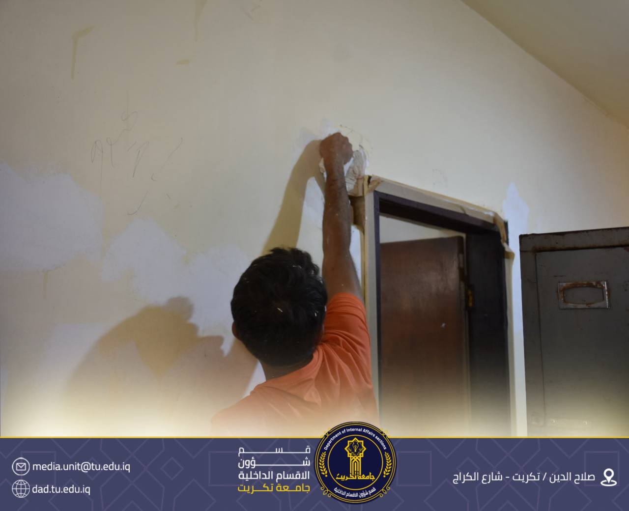 تابع الأستاذ الدكتور جاسم عباس علي مدير قسم شؤون الأقسام الداخلية في جامعة تكريت، سير أعمال حملة التأهيل الصيفي الجارية في مجمع القادسية، والتي شملت في مرحلتها الأولى تصليح وصبغ الجدران ضمن خطة لتأهيل القسم الداخلي.