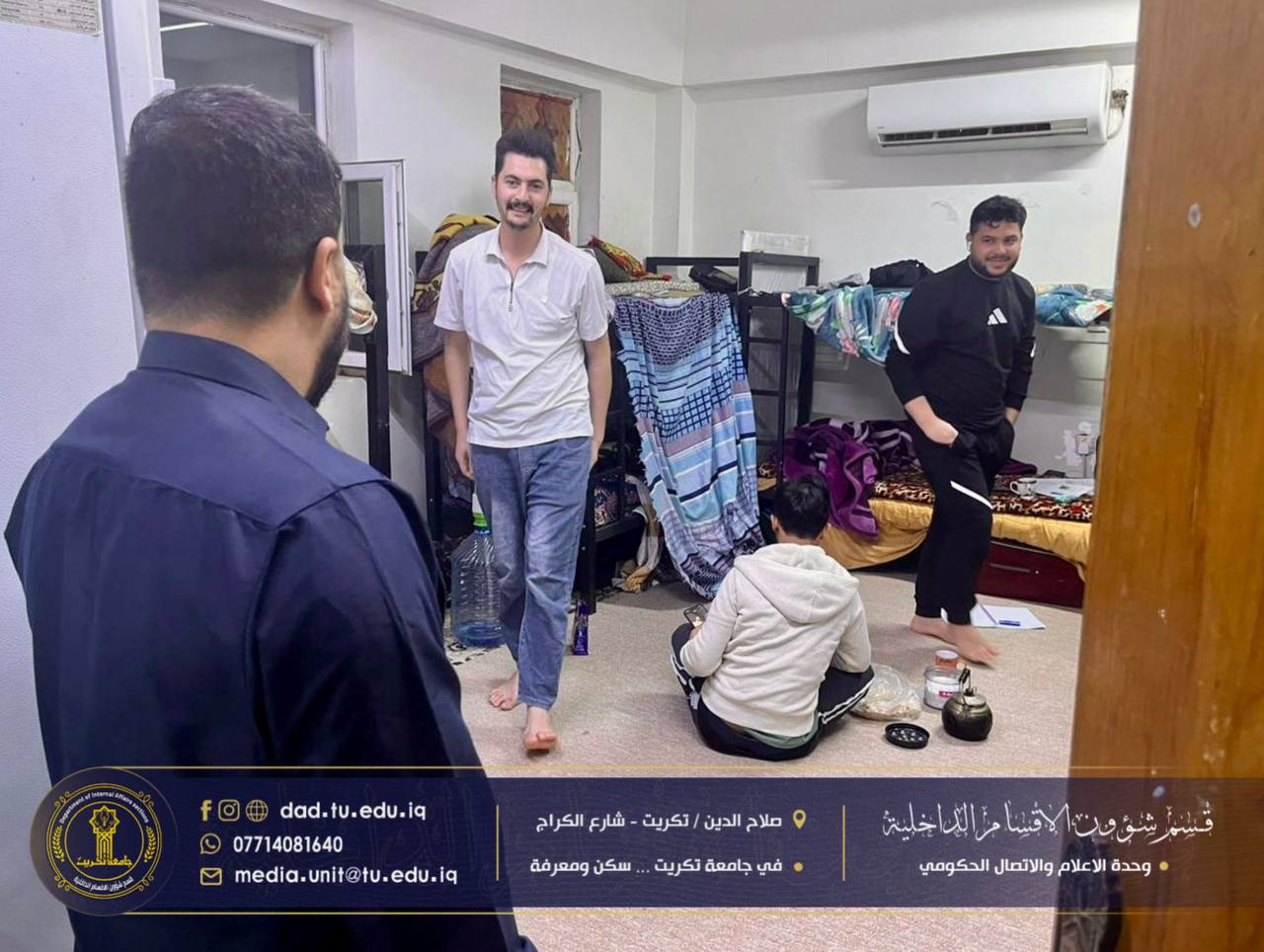 حيث تشدد رئاسة الجامعة على أهمية تعزيز التواصل مع الطلبة وتذليل العقبات التي قد تواجههم، وتأتي هذه الجولة في إطار النهج الذي تعتمده إدارة الأقسام الداخلية في جامعة تكريت لضمان بيئة جامعية متكاملة تلبي متطلبات السكن والدراسة.