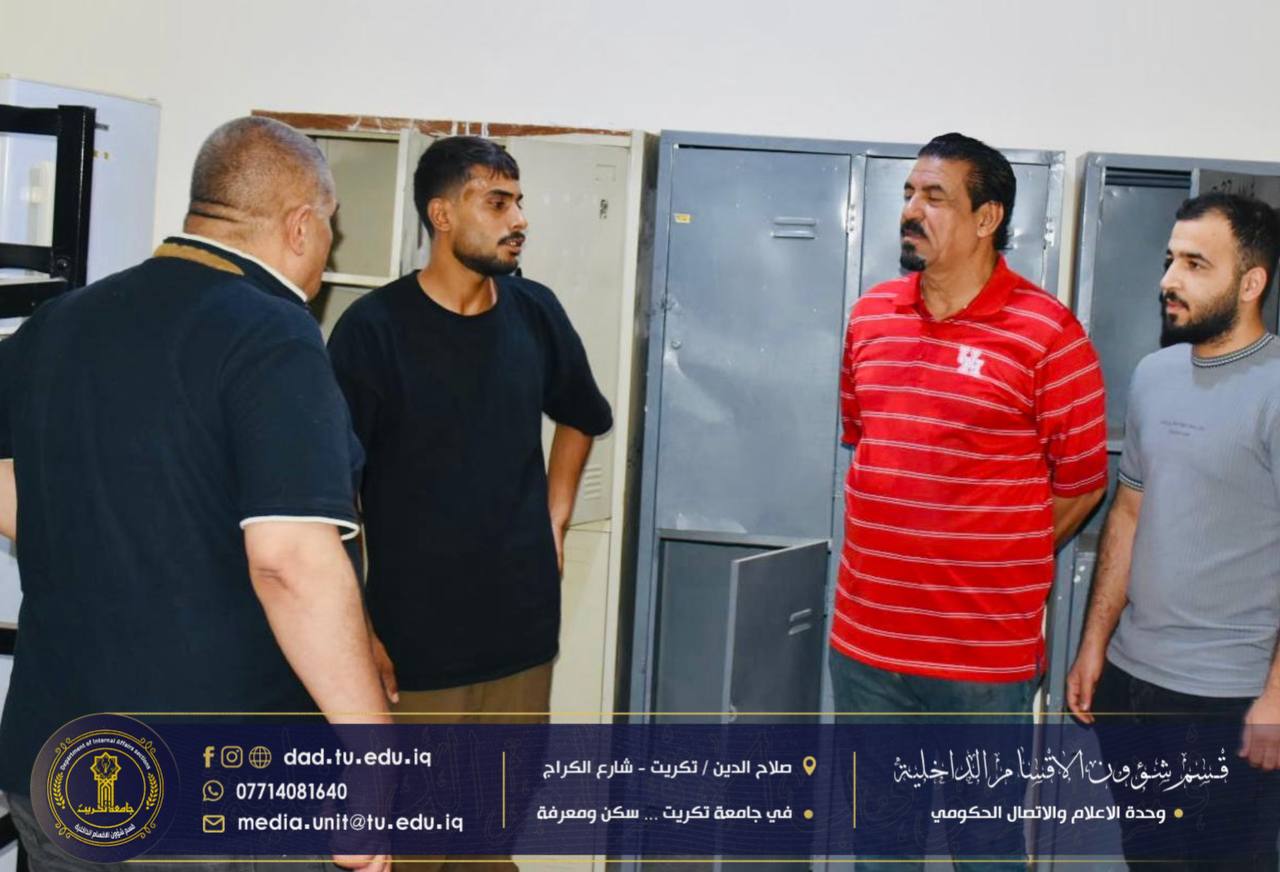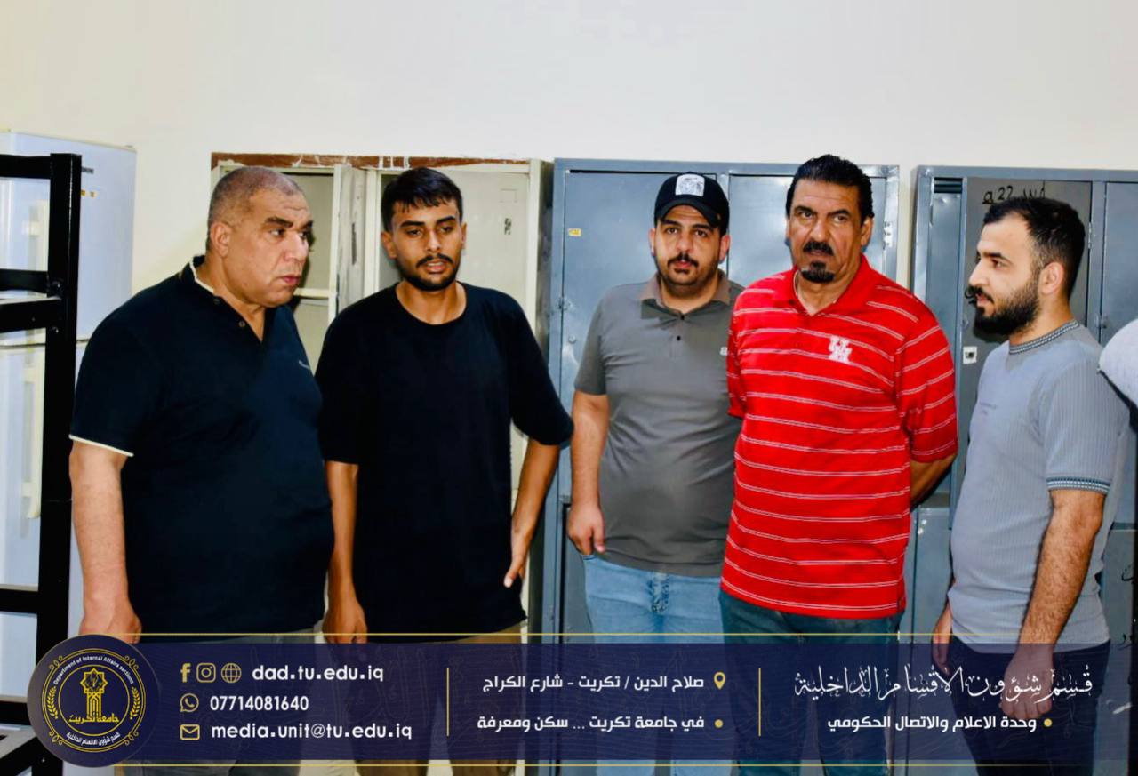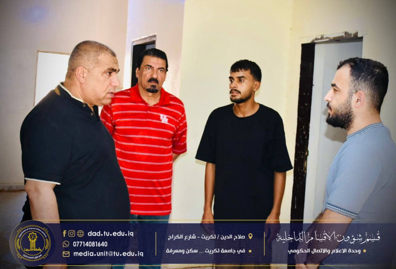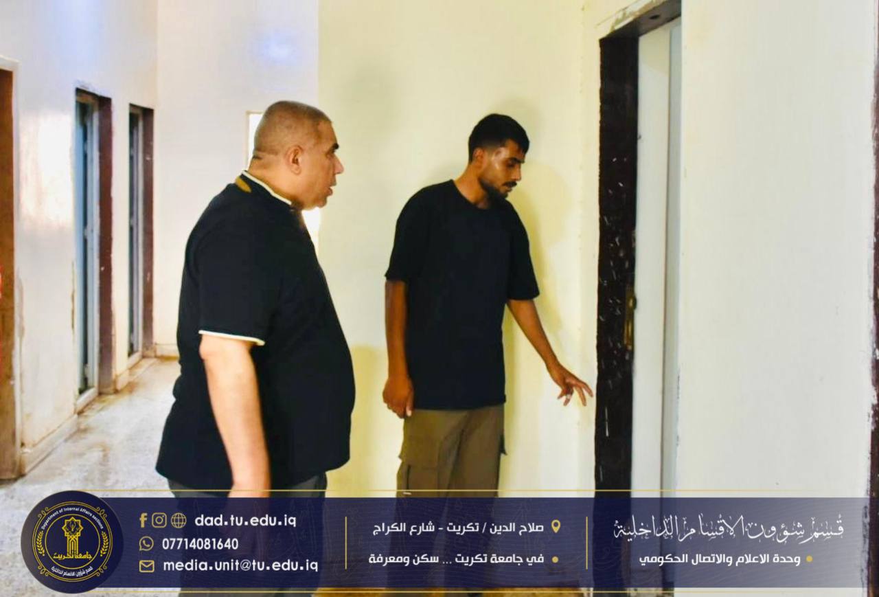 تنفيذاً لتوجيهات الأستاذ الدكتور وعد محمود رؤوف رئيس جامعة تكريت، أجرى الأستاذ الدكتور جاسم عباس علي مدير قسم شؤون الأقسام الداخلية، جولة تفقدية لطلبة الدور الثاني الساكنين في مجمع القادسية للطلاب.