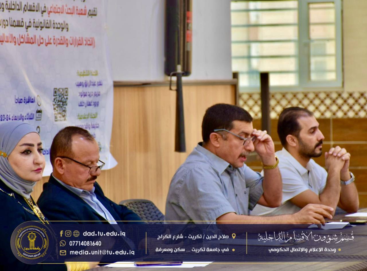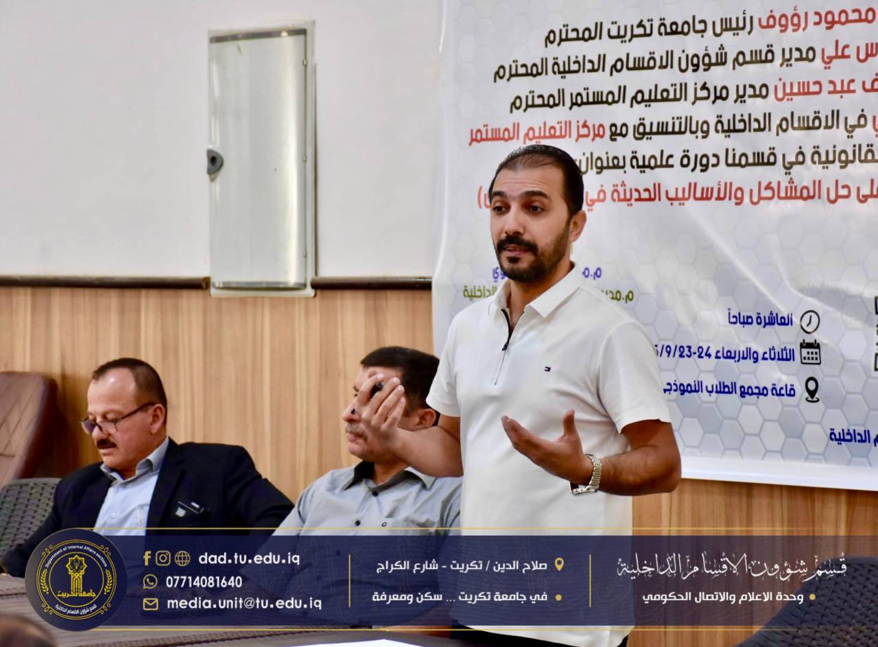برعاية الأستاذ الدكتور وعد محمود رؤوف رئيس جامعة تكريت، وبإشراف الأستاذ الدكتور جاسم عباس علي مدير قسم شؤون الأقسام الداخلية، أقامت شعبة البحث الاجتماعي دورة تدريبية إدارية بعنوان “اتخاذ القرارات والقدرة على حل المشاكل والأساليب الحديثة في إدارة المشكلات” على قاعة مجمع الطالبات النموذجي، بمشاركة عدد من الكوادر الإدارية والإشرافية في الأقسام الداخلية.