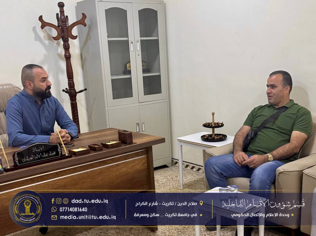 برعاية الاستاذ الدكتور وعد محمود رؤوف رئيس جامعة تكريت، وبمتابعة من الأستاذ الدكتور جاسم عباس علي، وبإشراف مباشر من السيد محمد عبدالاله مجيد أمين مجمع الأقواس، استقبل قسم شؤون الأقسام الداخلية الطالب علاء أحمد محمود من دولة فلسطين، أحد الطلبة المقبولين في كلية الإدارة والاقتصاد/ ماجستير إدارة الأعمال، ضمن مبادرة “ادرس في العراق” التي ترعاها وزارة التعليم العالي والبحث العلمي.