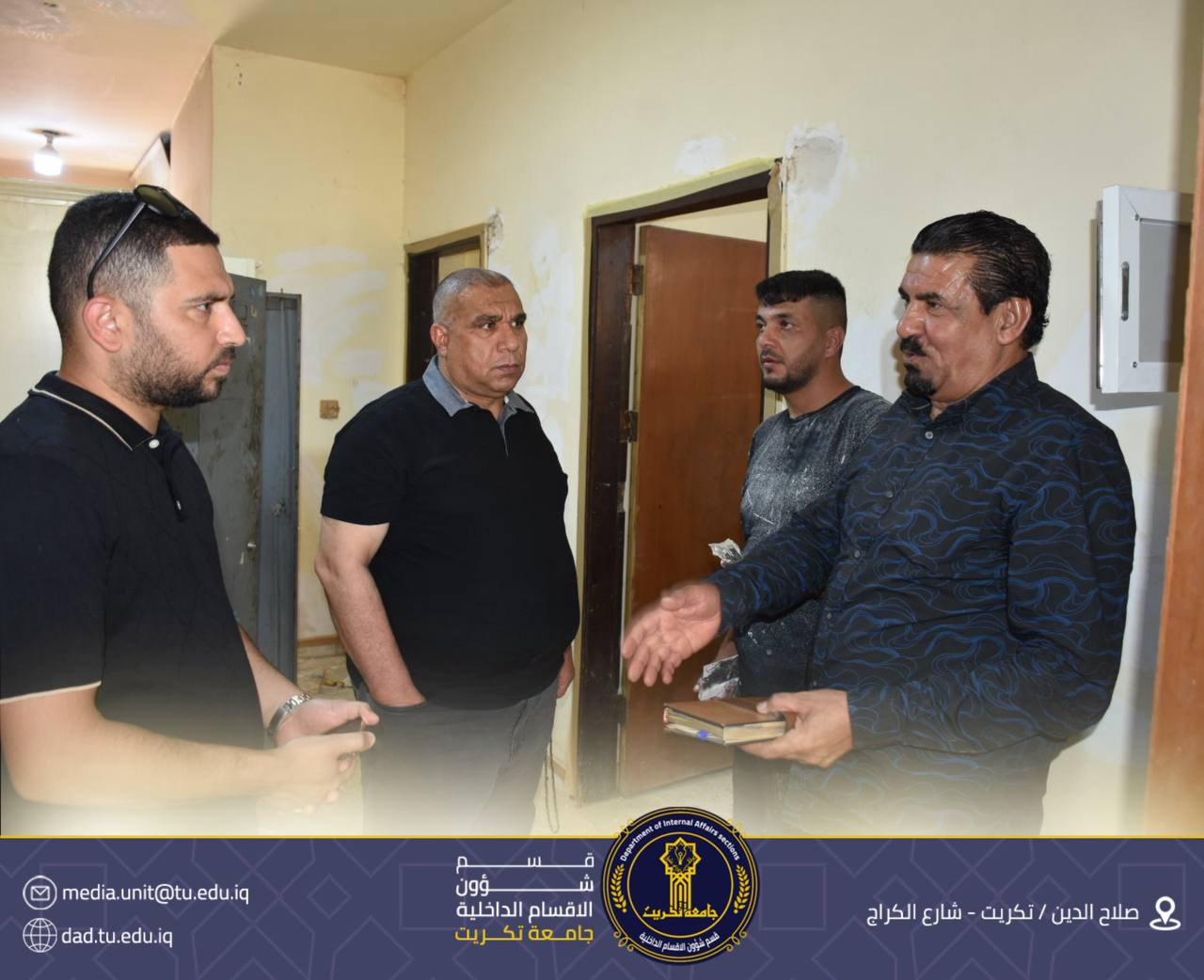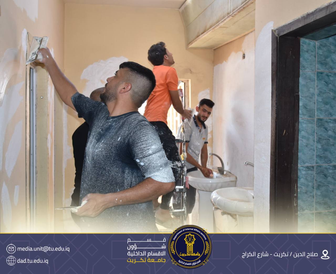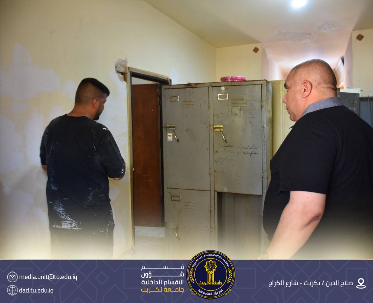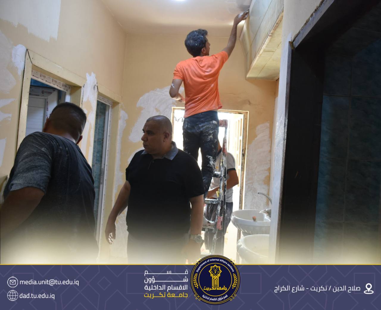تابع الأستاذ الدكتور جاسم عباس علي مدير قسم شؤون الأقسام الداخلية في جامعة تكريت، سير أعمال حملة التأهيل الصيفي الجارية في مجمع القادسية، والتي شملت في مرحلتها الأولى تصليح وصبغ الجدران ضمن خطة لتأهيل القسم الداخلي.