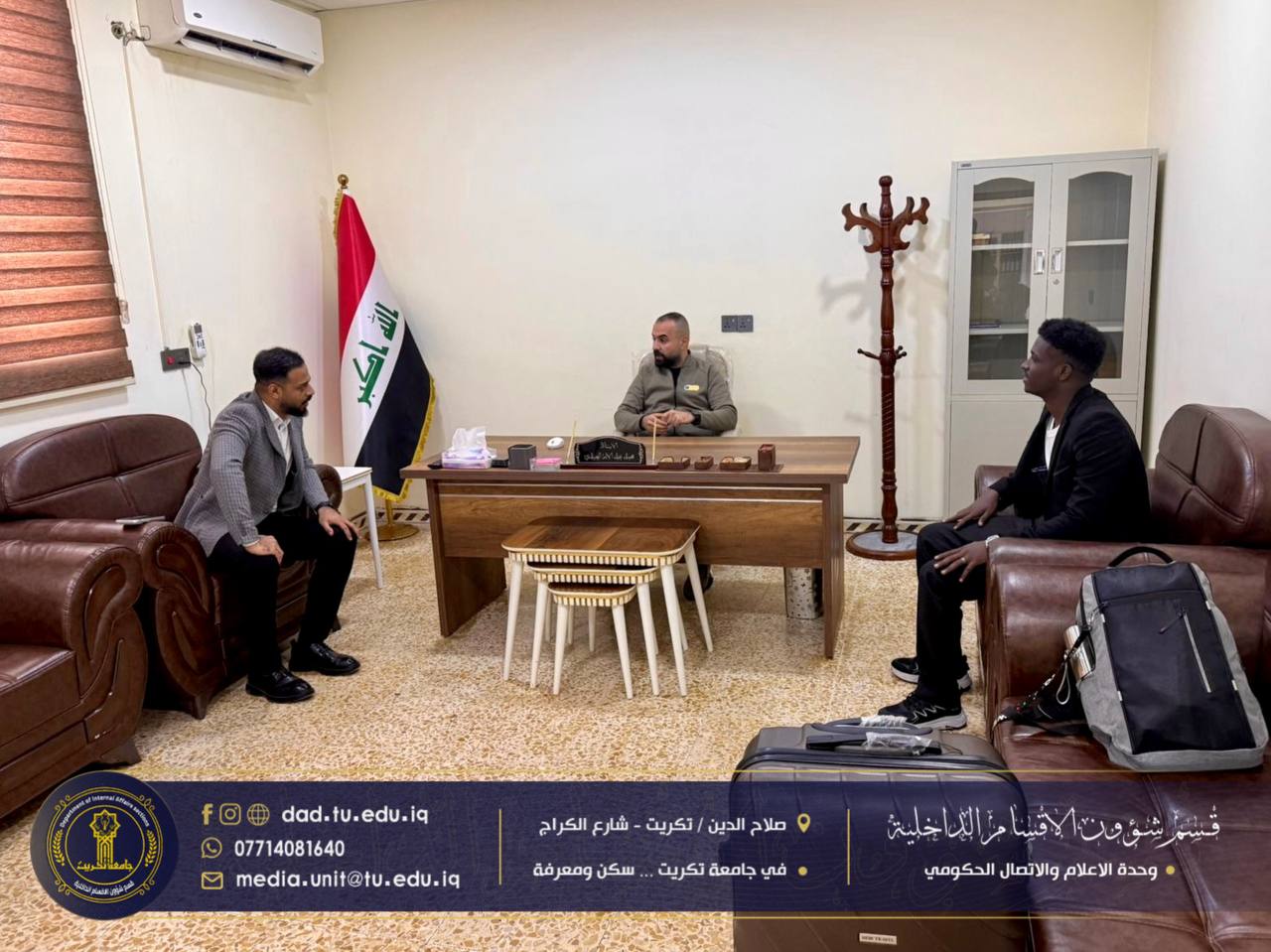 وبيّن الاستاذ الدكتور جاسم عباس علي ان الطالب تم إستقباله وتوفير متطلبات الإسكان الجامعي له، مع تقديم التسهيلات اللازمة لضمان اندماجه في البيئة الجامعية، وبما ينسجم مع توجيهات رئيس جامعة تكريت الاستاذ الدكتور وعد محمود رؤوف المحترم، في دعم الطلبة الوافدين وتوفير أجواء سكنية ملائمة تساعدهم على التفوق العلمي والاستقرار الدراسي.