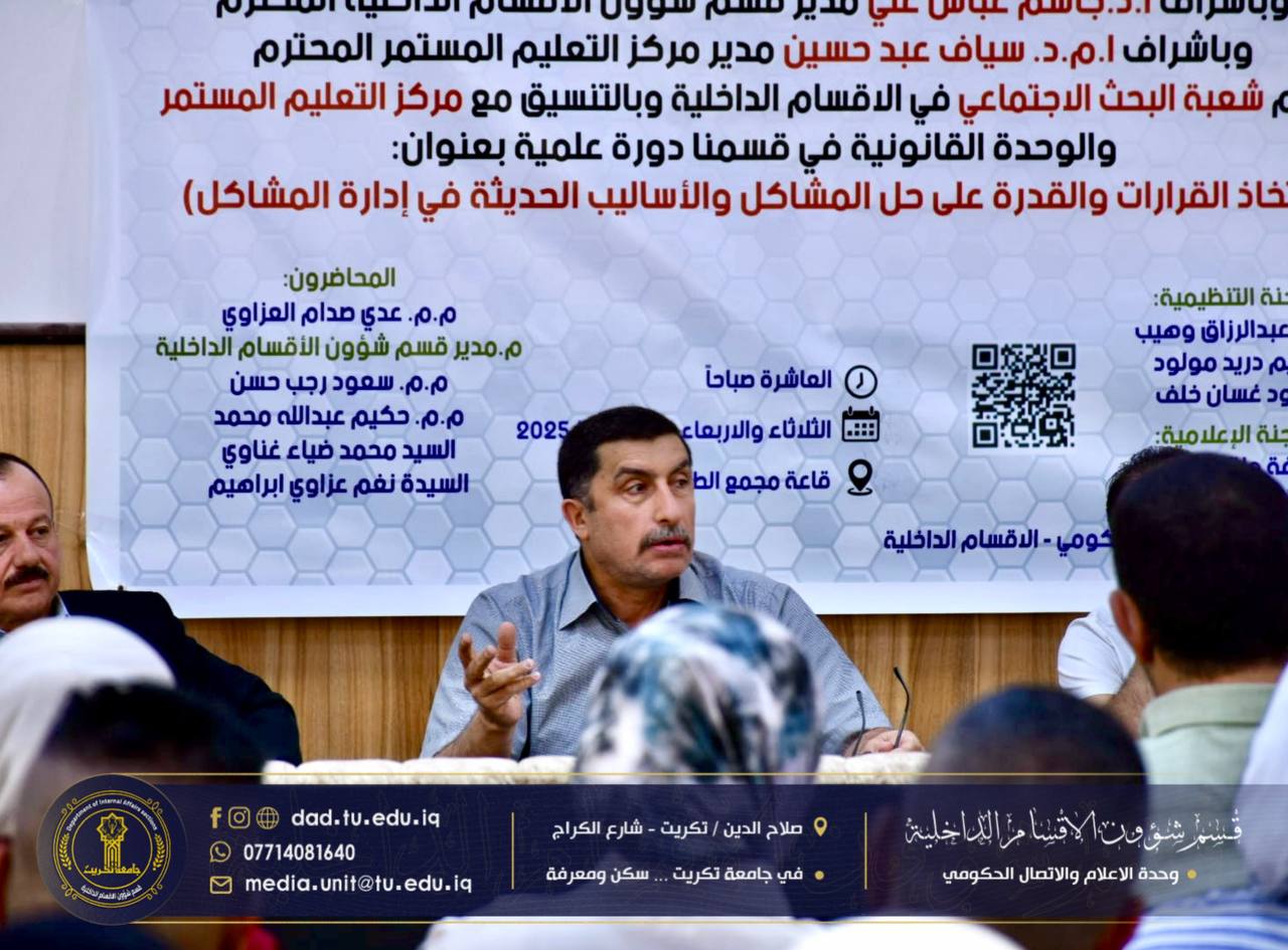 برعاية الأستاذ الدكتور وعد محمود رؤوف رئيس جامعة تكريت، وبإشراف الأستاذ الدكتور جاسم عباس علي مدير قسم شؤون الأقسام الداخلية، أقامت شعبة البحث الاجتماعي دورة تدريبية إدارية بعنوان “اتخاذ القرارات والقدرة على حل المشاكل والأساليب الحديثة في إدارة المشكلات” على قاعة مجمع الطالبات النموذجي، بمشاركة عدد من الكوادر الإدارية والإشرافية في الأقسام الداخلية.