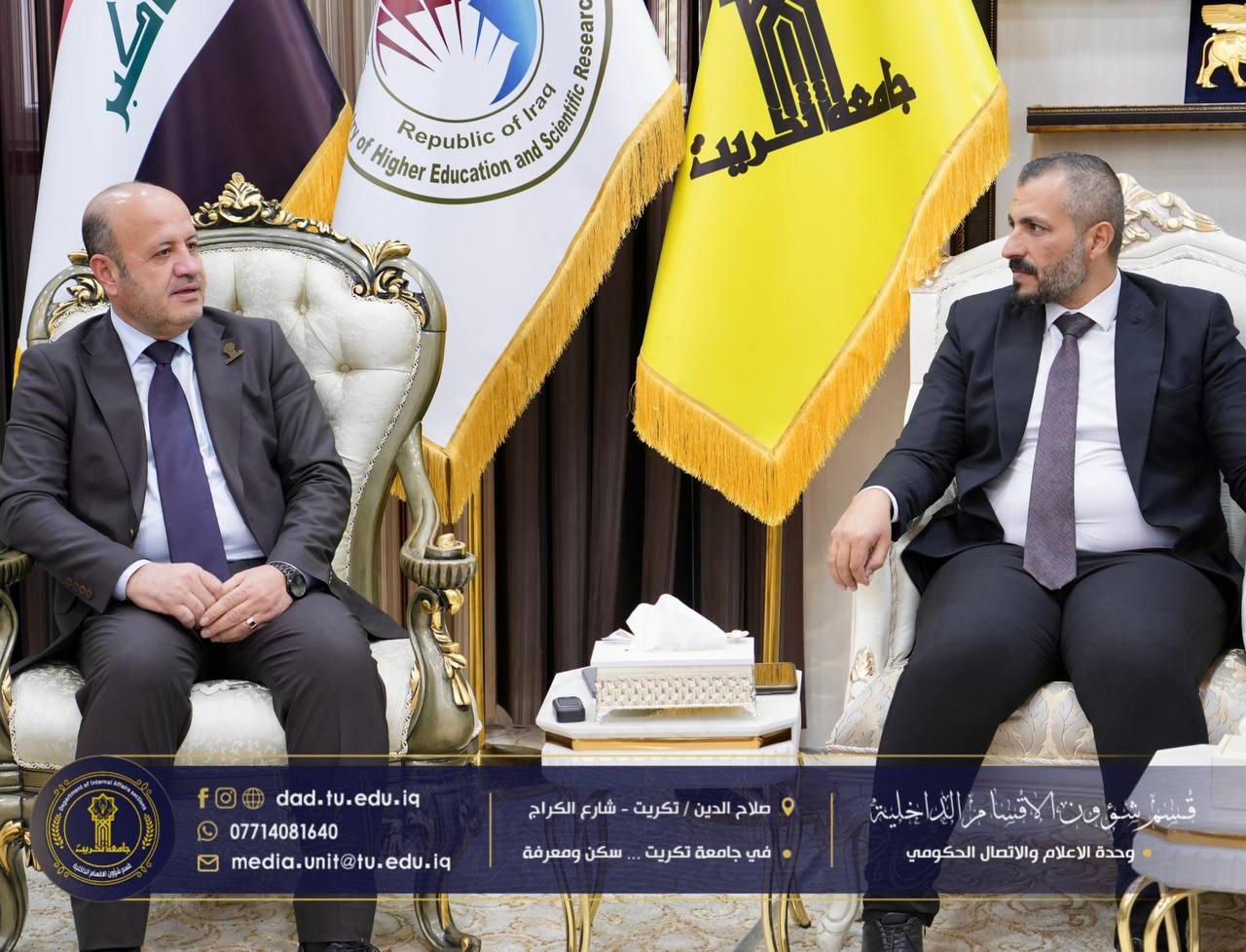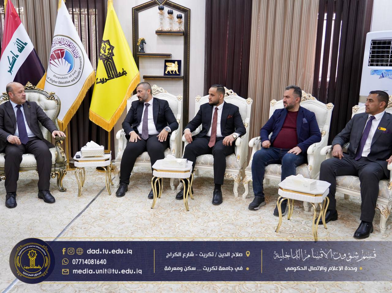 استقبل رئيس جامعة تكريت الأستاذ الدكتور وعد محمود رؤوف المحترم، لجنة جهاز الإشراف والتقويم برئاسة المدرس المساعد بسام كريم زيدان، وذلك في إطار متابعة الإجراءات الإدارية والفنية المعتمدة في الأقسام الداخلية، والاطلاع على مستوى الأداء المؤسسي والخدمي.